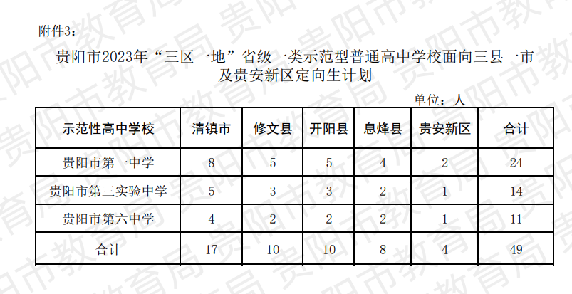 面向“三县一市”和贵安新区定向:指贵阳市第一中学、贵阳市第三实验中学和贵阳市第六中学将招生计划的2%用于“三县一市”和贵安新区招生;“三县一市”省级示范性普通高中学校,划出等额招生计划招收本县(市)以外的学生。北京师范大学贵安附校面向“三区一地”定向招收一定计划的学生。