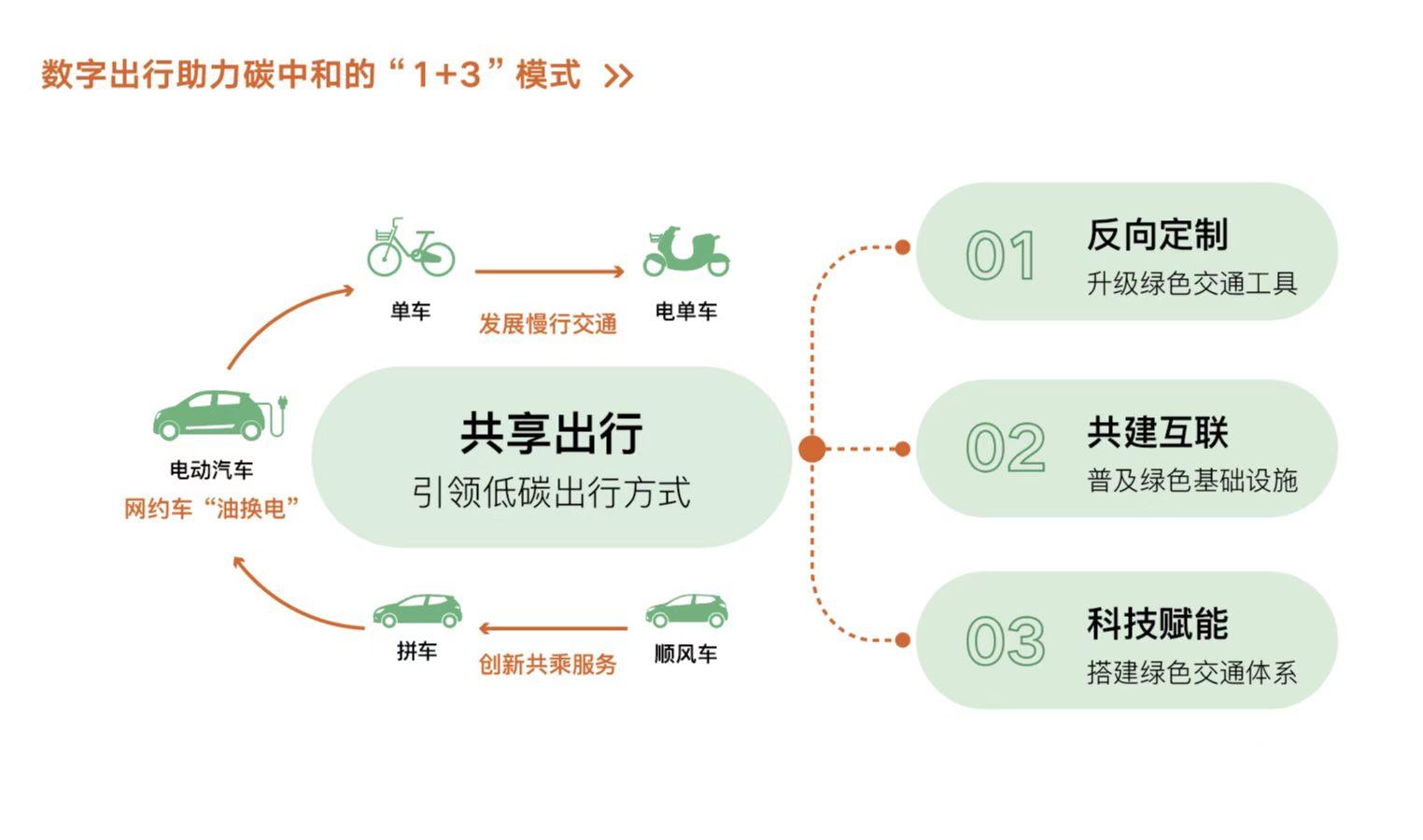滴滴作为数字出行领域的重要参与者,以“让出行更美好”为使命初心,提出了助力碳中和的“1+3”模式。其中,“1”是指通过模式创新,引领以共享出行为代表的低碳出行方式带来直接减碳效应;“3”是指三个带动上下游产业链的低碳绿色转型的“外溢效应”,包括以“反向定制”升级绿色交通工具,以“共建共享”普及绿色基础设施,以“科技赋能”搭建绿色交通体系。