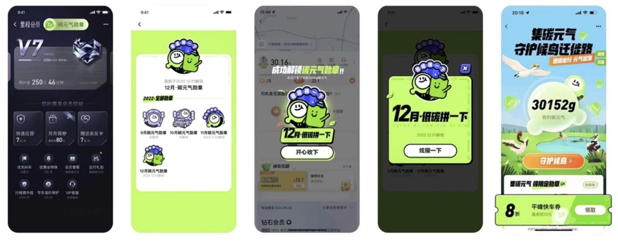 2022年,滴滴推出“碳元气”环保项目,在用户端打车全流程上进行创意化低碳出行引导,做到出行减碳可量化、可视化、可参与、可分享。项目实现了用户低碳出行减碳量单单可量化、单单可累计,通过月度碳元气勋章、低碳出行打车券等荣誉和物质方面激励,进一步引导用户更多参与绿色低碳出行,用户也可以参与守护候鸟公益,保护生态环境和生物多样性。目前,“碳元气”项目已在全国298个城市上线。