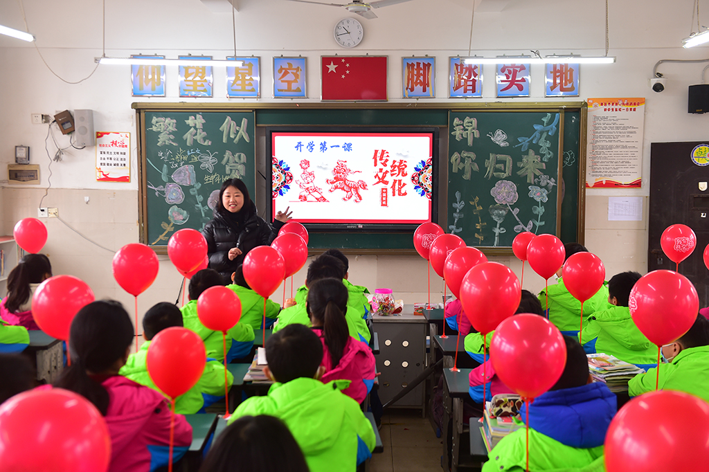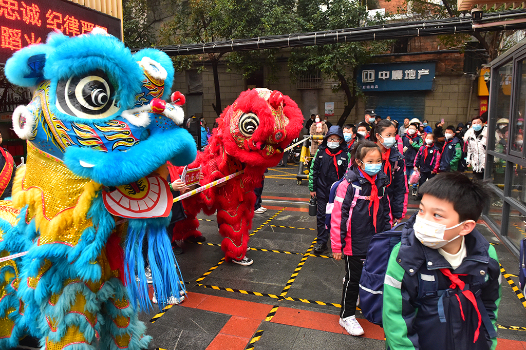 2月6日,江西南昌市东湖区的邮政路小学“醒狮”迎学生,开启新学期。 人民网 时雨摄