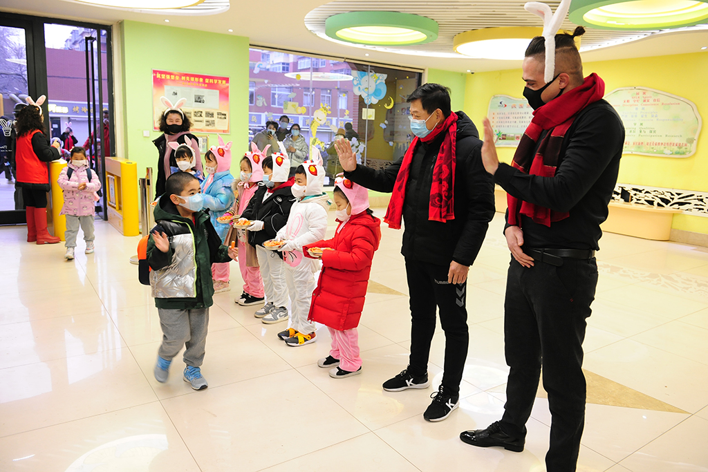 2月7日,河北石家庄外国语教育集团幼儿园开学第一天,老师和每一位孩子击掌,祝福并鼓励孩子们新学期加油。人民网 周博摄