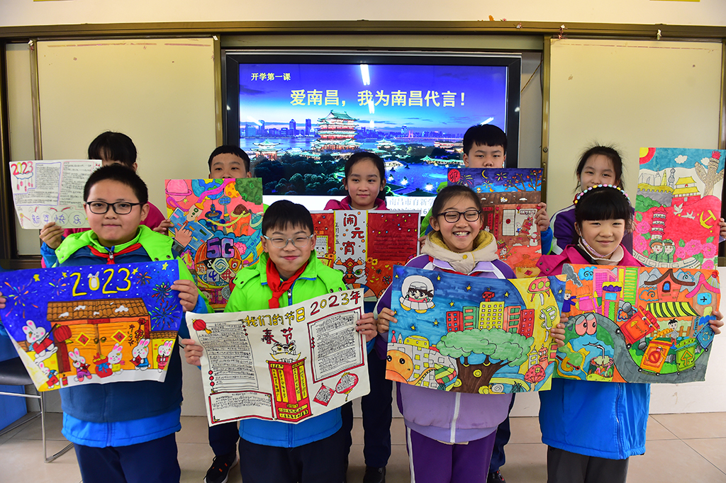 2月6日,江西南昌育新学校教育集团的同学们展示“美好家乡”手抄报。 人民网 时雨摄