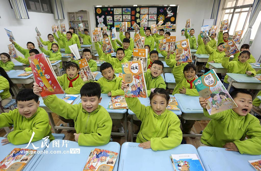 2月6日,陕西渭南临渭区北塘实验小学二年级四班,学生展示自己喜欢的科目书籍。崔正博摄(人民图片网)