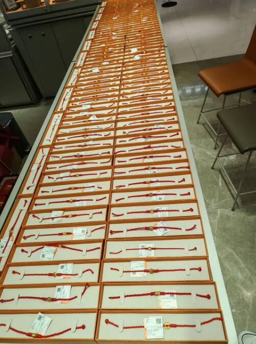 刘店长告诉记者,这238件黄金饰品主要为黄金手链,在红绳上编进黄金首饰,春节将至,寓意好又十分应景。其中,有的是顾客选购的品牌成品手链,有的则由顾客选定黄金吊坠,再由柜台工作人员手工编织而成。