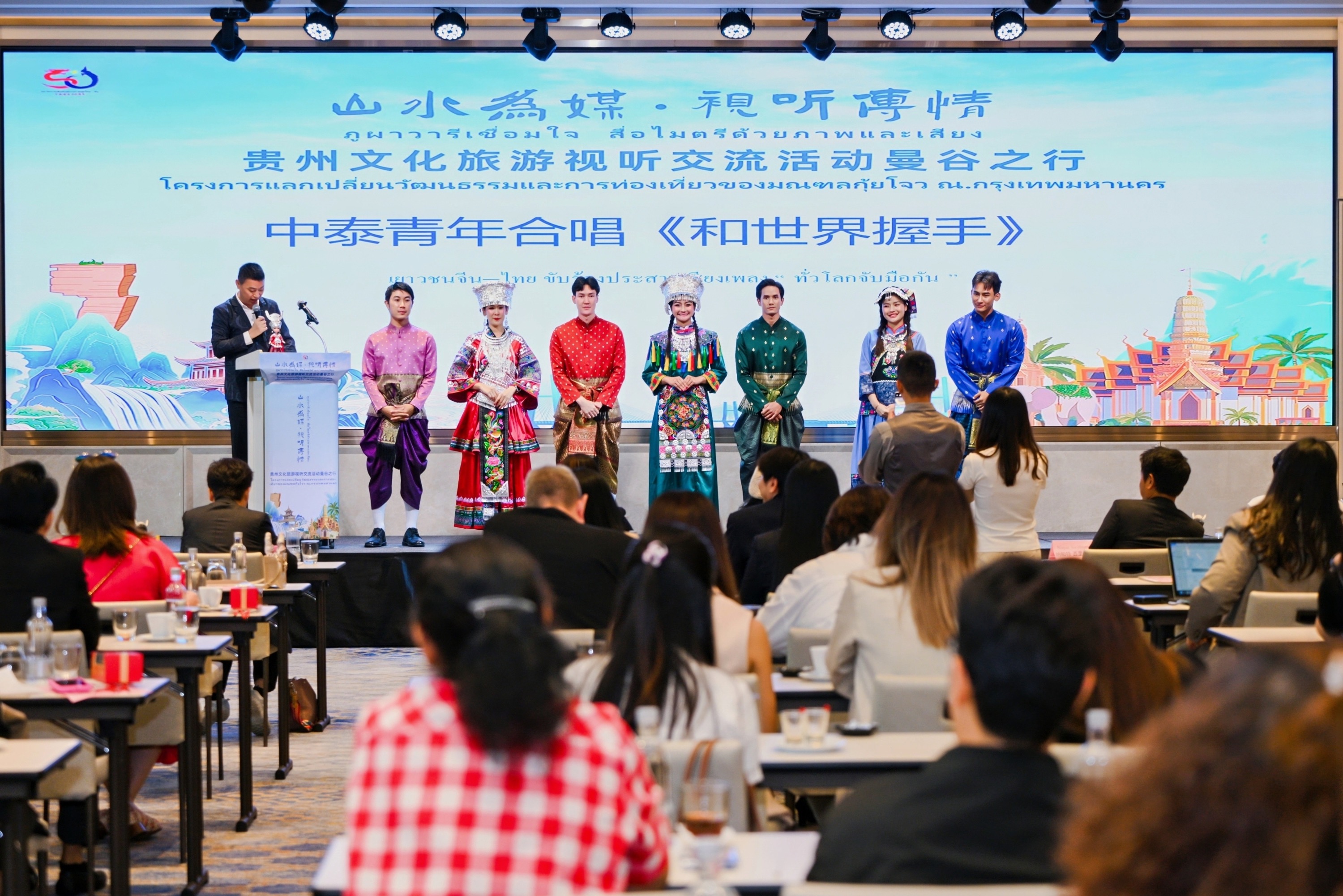 活动特别设置“黔纹泰答——贵州非遗互动展示”环节,通过非遗服饰展示、趣味问答等形式,增强两地文化互动。活动在人工智能辅助创作的中泰青年对唱歌曲《和世界握手》中圆满落下帷幕。这首以现代科技融合传统情谊的作品,以其真挚动人的旋律,为整场交流活动画上了一个充满未来感的句号,生动诠释了中泰两国人民心灵相通、携手共进的美好愿景。