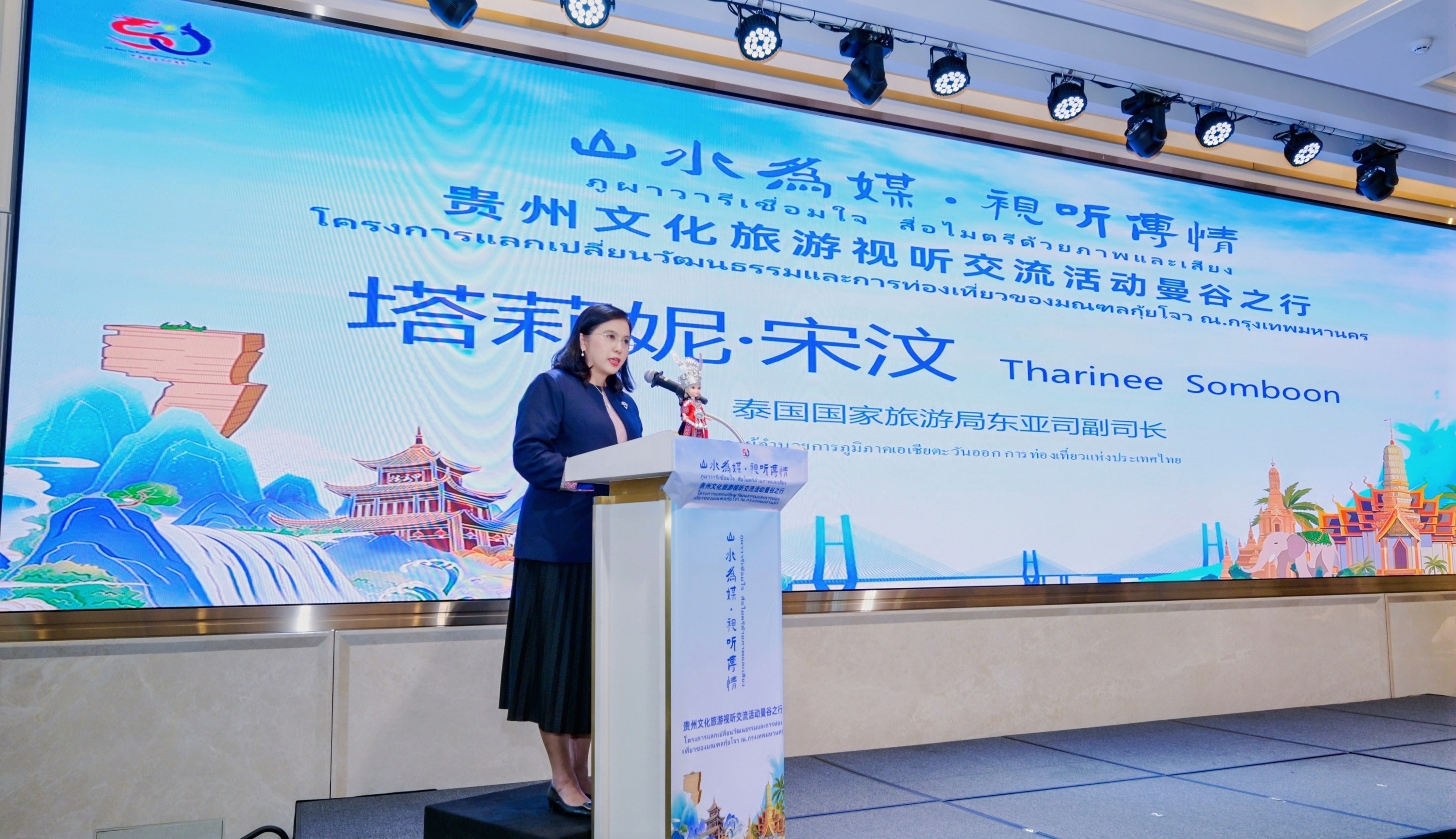 贵州广播电视台国际传播中心副主任兼卫视中心副主任黄蓓作主题推介。她巧妙联结两地饮食文化,并借助贵州“万桥飞架”的工程奇迹、“村”字号活动的活力场景,以及“有朋自远方来”的开放胸襟,向泰国观众生动讲述了发展、活力、开放的贵州故事,发出诚挚的贵州之约。