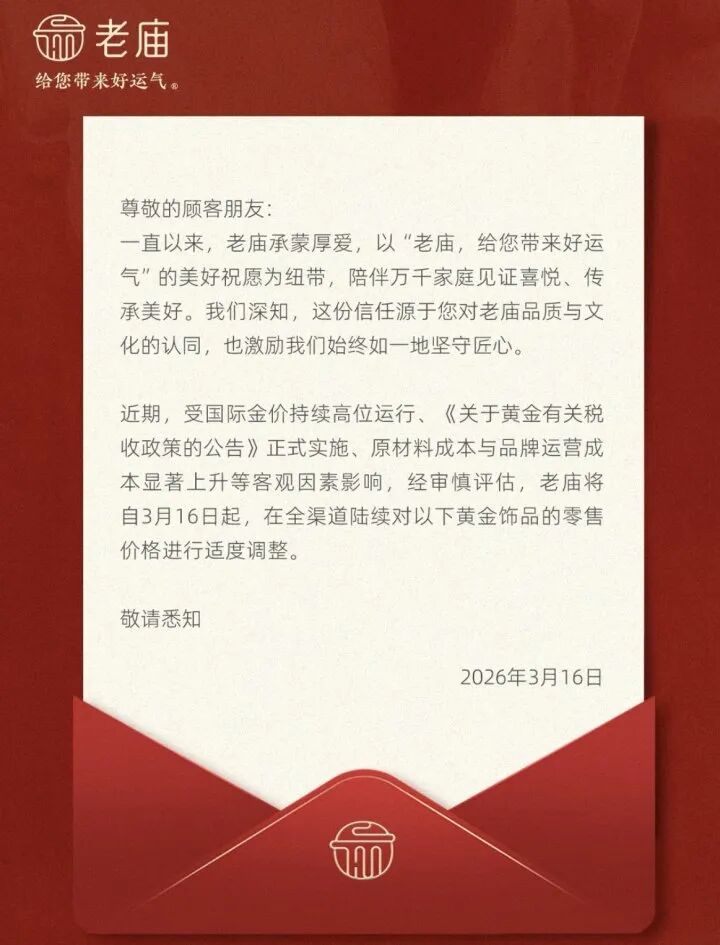 老庙黄金发布公告,因为受原材料成本与品牌运营显著上升等因素影响,从3月16日起,在全渠道对黄金饰品的零售价格进行适度调整。