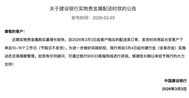 3月3日,建行发布公告称:因为实物贵金属购买数量增长较快,自3月3日起客户购买的配送类订单,发货时间将延长至客户下单后10-15个工作日(节假日不发货)。同时为了进一步做好风险防控,我行自3月4日起对建行金(含易存金)实施动态交易限额管理。