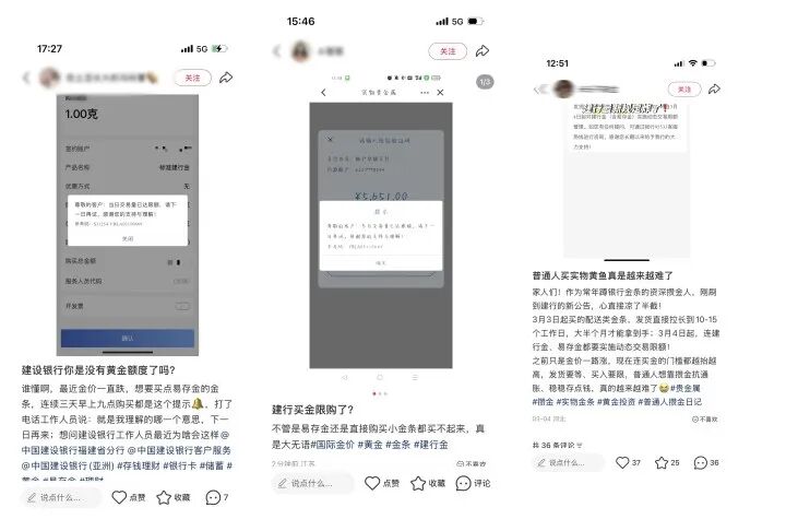 最近,网上不少和陈小姐一样的攒金族遇到类似的问题。一位网友说:“之前只是金价一路上涨, 现在买金的门槛越抬越高,发货要等,买入要限,普通人想攒金抗通胀,真的越来越难了。”