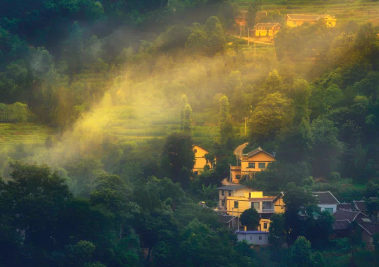 几栋青瓦灰墙的楼房坐落于山间,被大自然紧紧包围,朝看远山梯田层叠,暮看落日晚霞成画,这里便是余庆坊·红渡民宿。