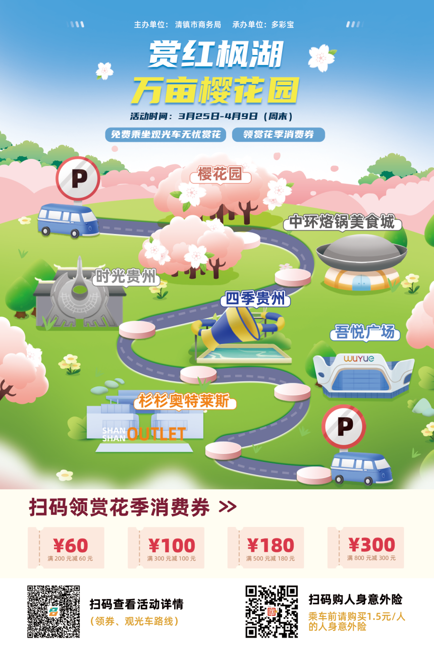 由清镇市商务局主办,多彩宝公司承办的“‘樱’你而来·醉美湖城”促消费活动将于3月25日起正式启动。此次活动依托清镇市红枫湖万亩樱花园,联动杉杉奥特莱斯、吾悦广场、时光贵州、中环美食广场等消费场景,为游客踏青赏花、餐饮消费提供多样化选择,助力清镇市消费市场快速回暖。
