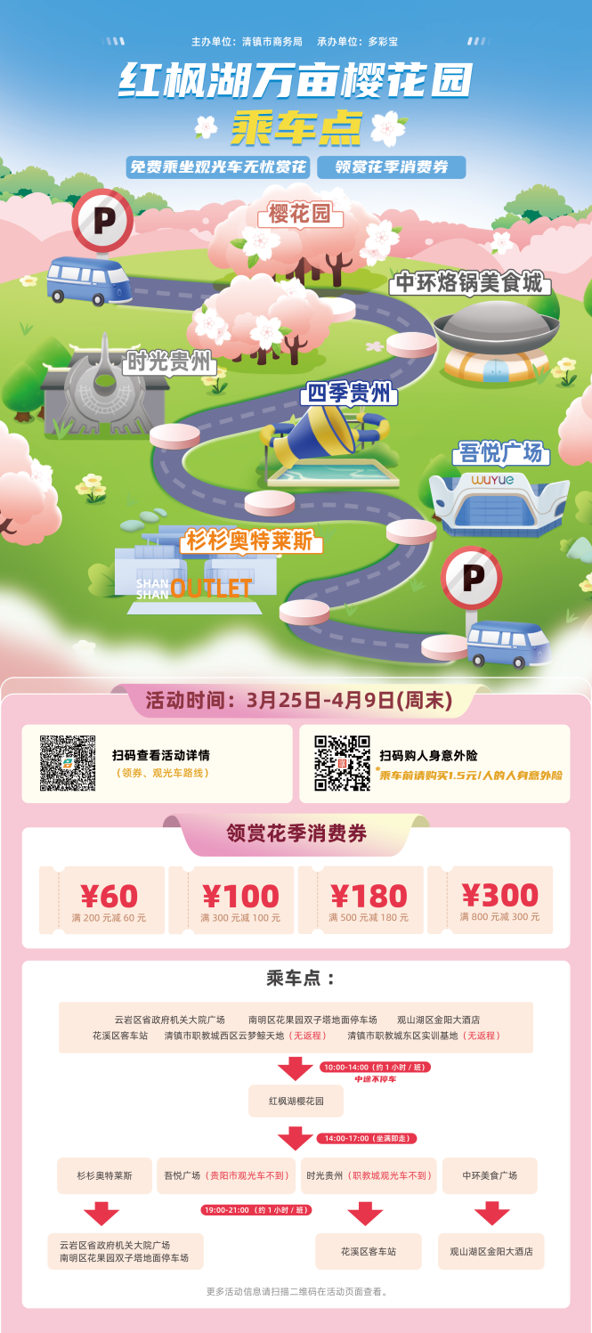 据了解,3月25日至4月9日,每周末(3月25日、3月26日、4月1日、4月2日、4月8日、4月9日),清镇市均计划开展“‘樱’你而来·醉美湖城”促消费活动,省内外游客可免费乘坐活动大巴前往清镇红枫湖万亩樱花园赏花,赏花后,活动大巴还将带领游客前往中环国际、吾悦广场、杉杉奥莱等商圈购物游玩。