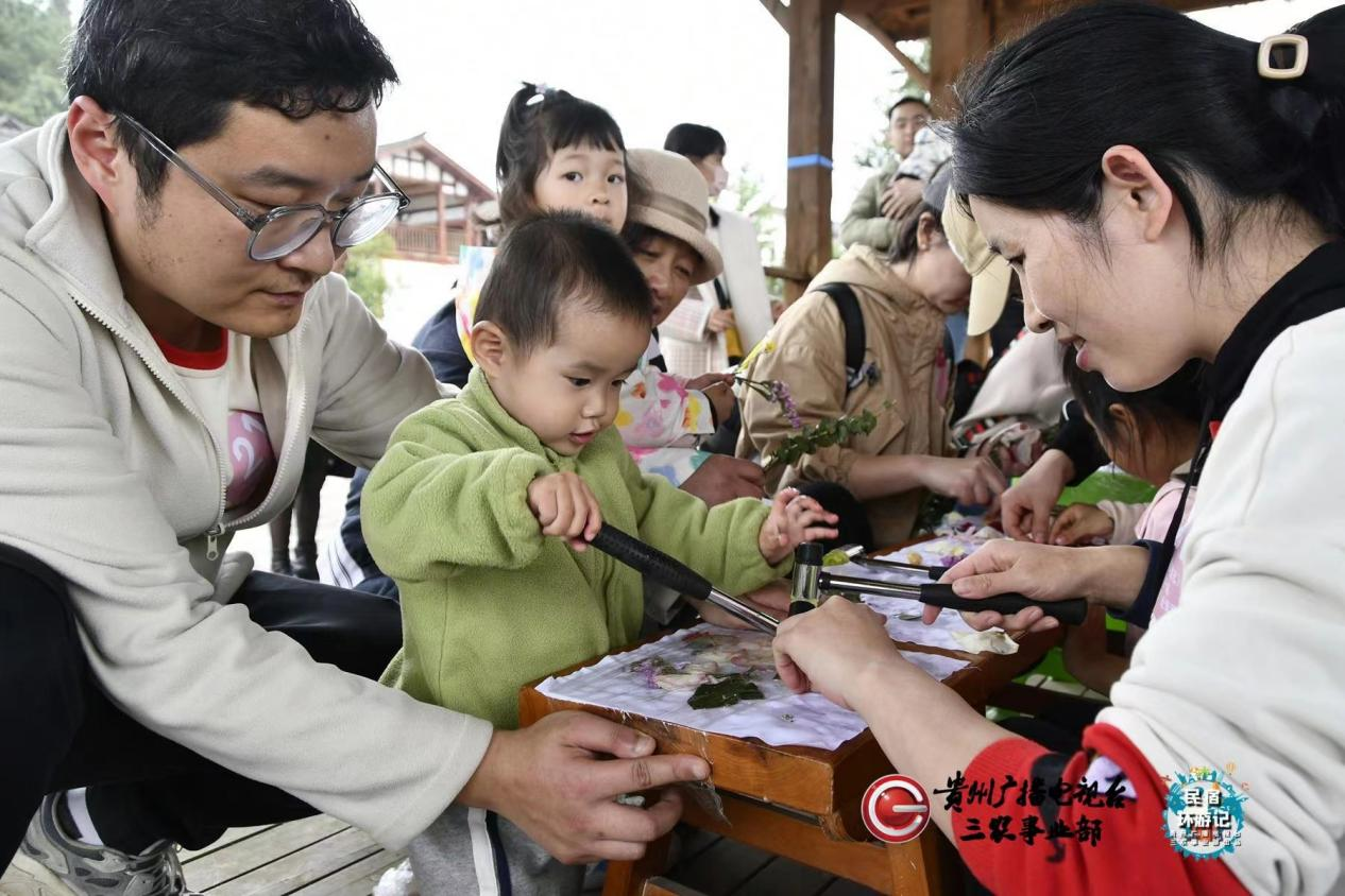 除了植树活动外,《民宿环游记》的主持人还组织大家以家庭为单位参与非遗鲜花拓印,用童趣画春天活动。一锤、一花瓣、一白布、一保鲜膜,让孩子们将书本中的知识跃然纸上。活动一开始,孩子们就迫不及待的用花瓣绘出五颜六色的春天,在叮叮当当的锤子声中,把春光留在童趣中,把孩子的天性释放在欢声笑语中。既让孩子们近距离亲身感受大自然的魅力,也让孩子认识和感受非遗。