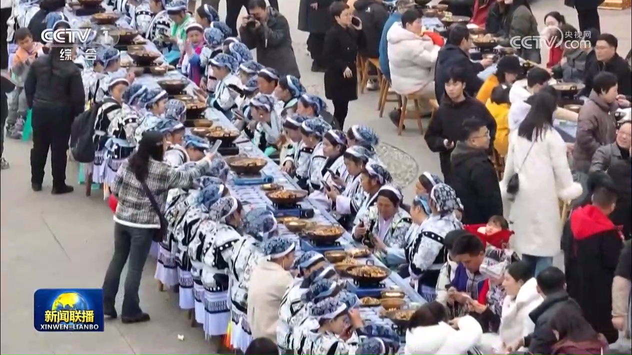 申遗成功后的首个春节。人们在丰富多彩的活动中,沉浸式体验中华优秀传统文化。在贵州黔南州福泉市仙桥村,村民将长桌儿一字排开,和游客共享特色美食。