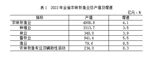 2月18日,记者从贵州省统计局获悉,2022年全省农林牧渔业总产值实现4908.8亿元,同比增长4.1%。其中,农业总产值3313.7亿元,增长3.5%;林业总产值340.0亿元,增长3.9%;畜牧业总产值941.4亿元,增长3.5%;渔业总产值79.6亿元,增长6.5%。