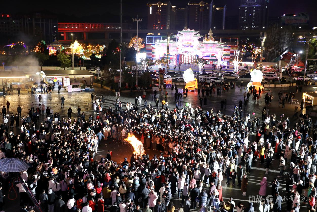 临近午夜,多彩贵州城鼓楼华灯璀璨,由肇兴侗寨寨老主持的侗语祈福和芦笙齐鸣,将跨年夜氛围推向顶点,市民游客围绕篝火,与身着民族盛装的演员们共舞。