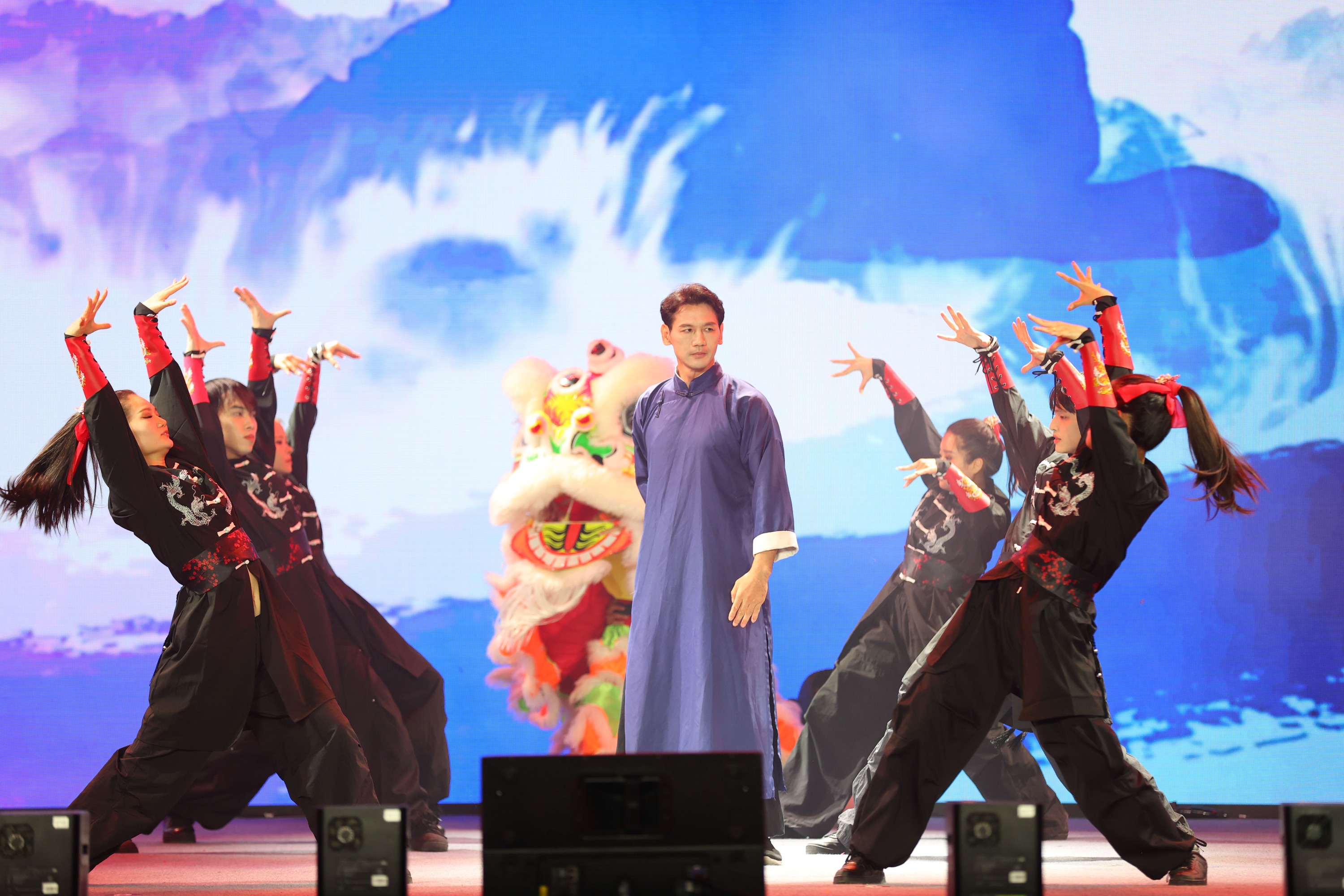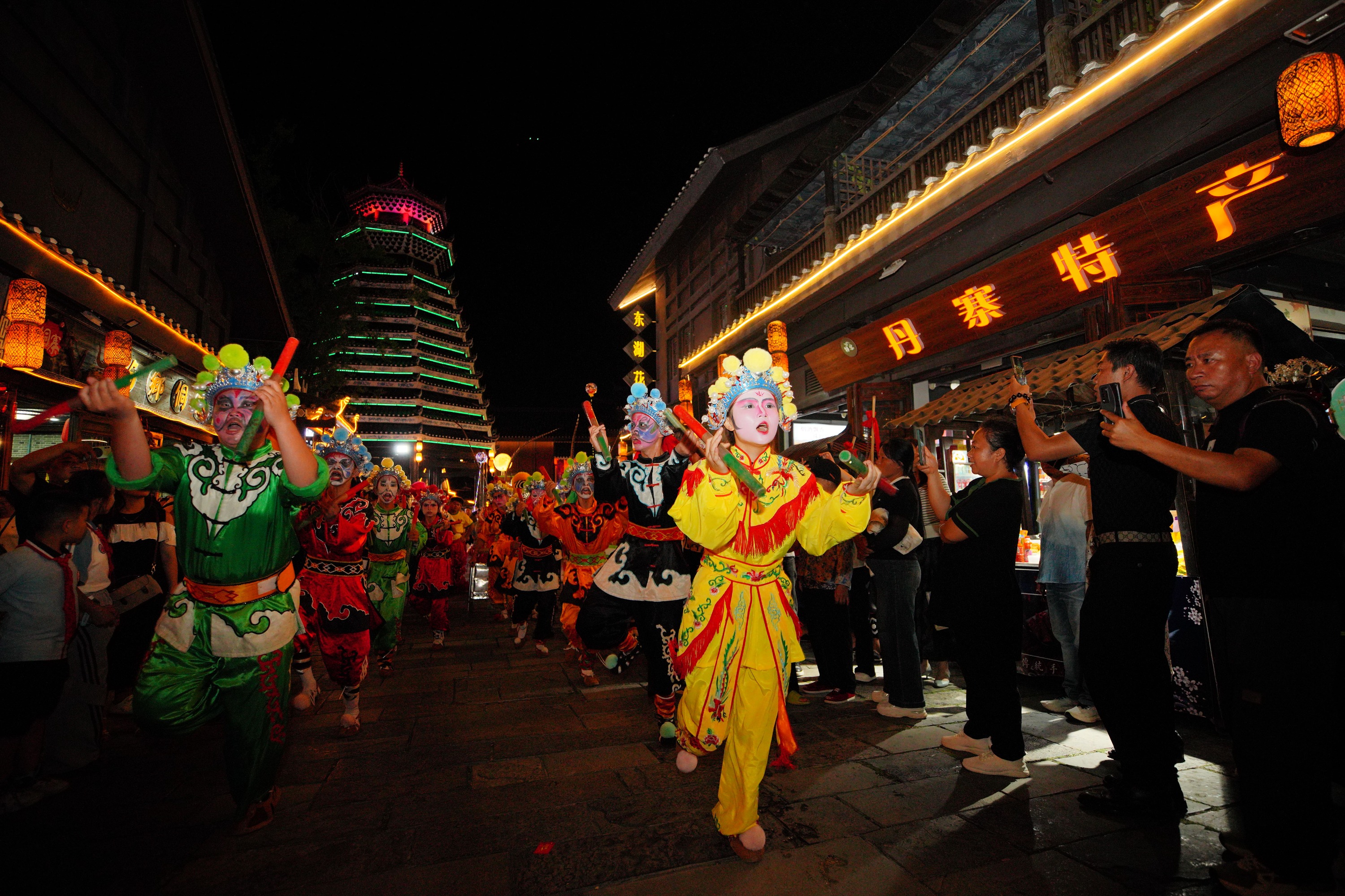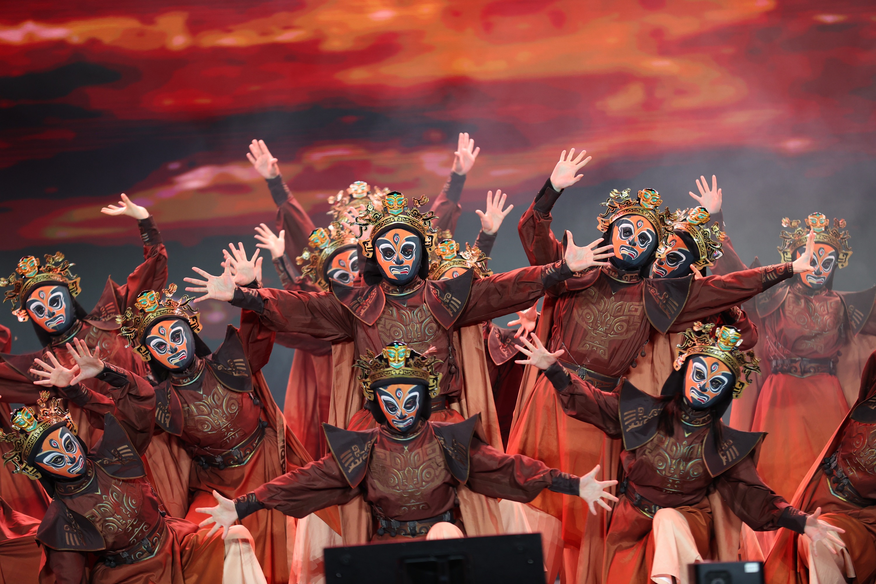 当晚,万达小镇尤公广场上灯火辉煌,开幕式在极具民族特色的非遗展演中拉开序幕。侗族大歌《天籁之声》,川剧变脸《古蜀天边行》,陕北说书《三秦之声》,醒狮、咏春、粤剧《狮武岭南》,民族团结大联欢《多彩和鸣》等由多项国家级非遗代表性项目融合编排的节目先后登场,精彩绝伦、风格迥异的非遗展演,犹如一颗颗璀璨的明珠,串联起中华民族悠久的文化脉络,为现场观众带来了一场视听盛宴。