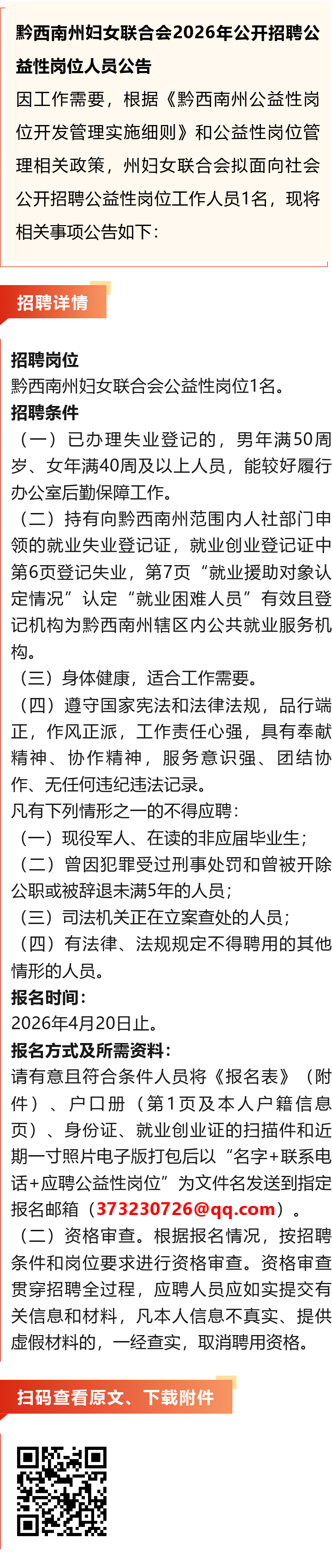 黔西南州妇女联合会招聘!报名截止时间:2026年4月20日!