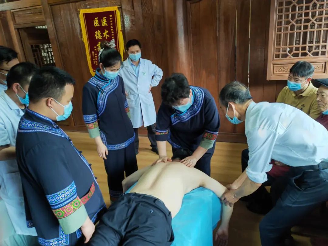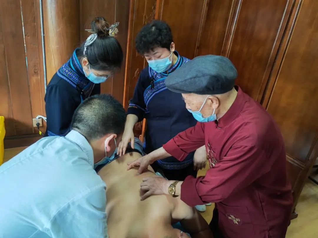 在“非遗”体验活动过程中,群众参观了医馆的非遗产品展示区,充分了解民族医药特色。松桃苗医药挑痧疗法传承人石仙妹、砖熨疗法传承人石再芬、苗医药时珍药饼灸李杰、十方脉法传承人唐荣成和玉屏侗医正骨整脊技术传承人田代刚传统中医药非遗传承人免费为群众开展特色疗法。