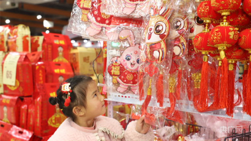在县城,每条街道,仿佛进入一片红色的海洋。大红灯笼旋转闪烁,电子鞭炮噼啪作响,兔子玩偶站在福字旁双手作揖……对联、挂饰被摘下又补上,一箱箱商品被打包寄走,喜庆又繁忙。