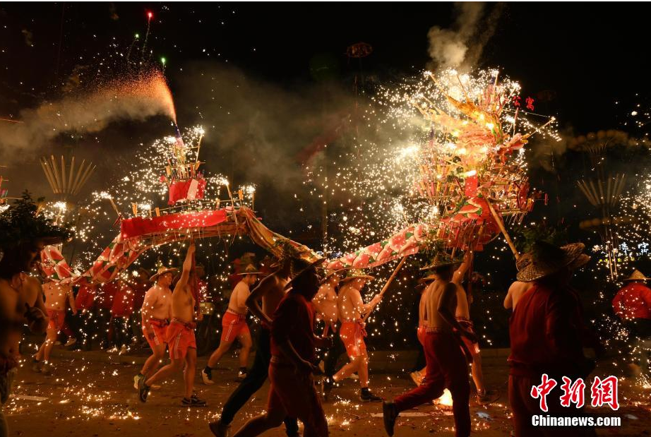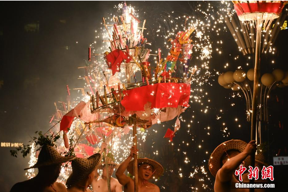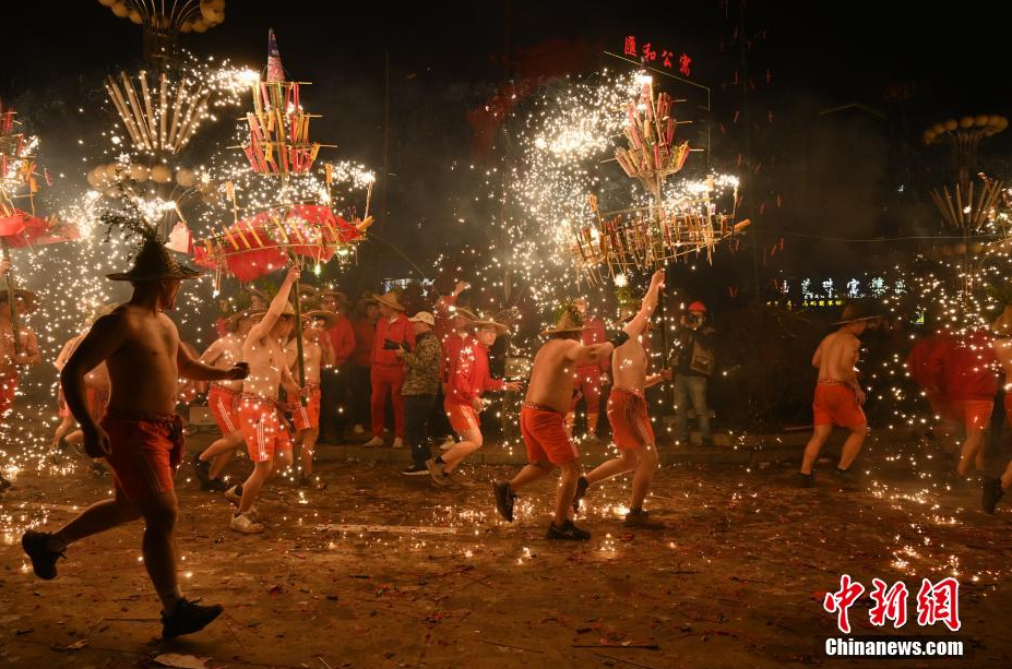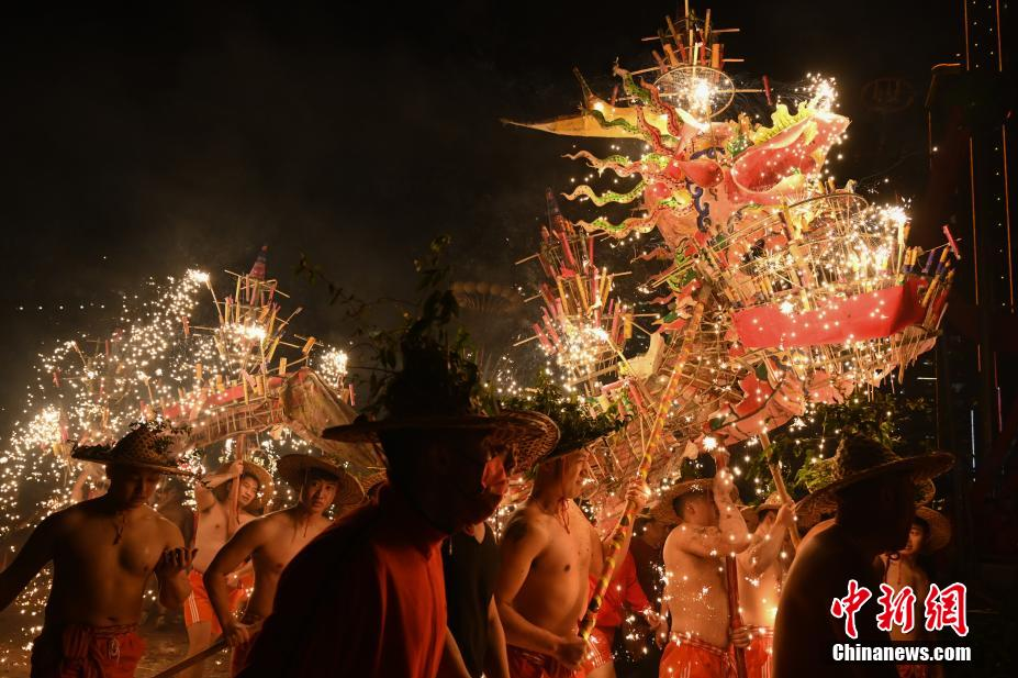 乔林烟花火龙分为“游龙”“舞龙”“烧龙”三种形式,正月初一到初五开始游龙、舞龙活动,正月初十晚的“烧龙”表演则迎来活动最高潮。2008年,乔林烟花火龙入选国家级非物质文化遗产名录。图为舞龙队托举祥龙巡游。 黄晨发 摄