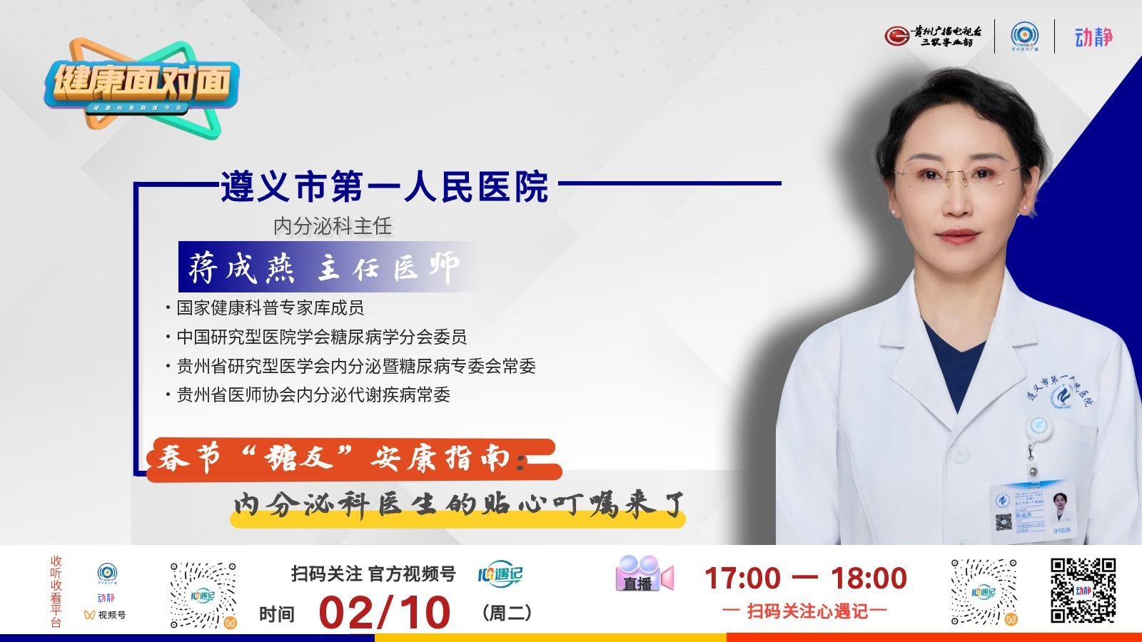 2月10日17:00-18:00,贵州经济广播《健康面对面》节目,特别邀请遵义市第一人民医院内分泌科蒋成燕主任做客直播间,为您带来一场干货满满的直播!