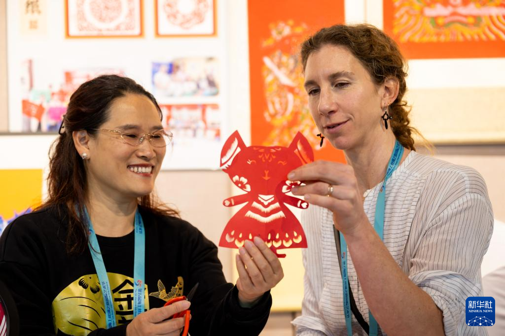 12月9日,来自意大利的艺术家(右)向国家级非物质文化遗产——漳浦剪纸市级代表性传承人游金美学习漳浦剪纸技艺。新华社记者 魏培全 摄
