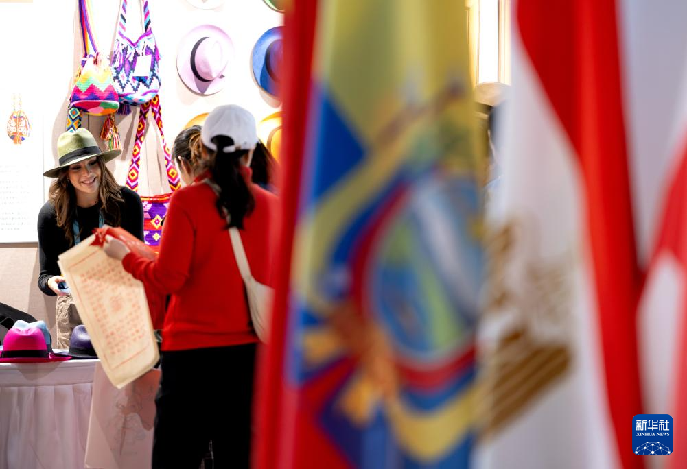 12月9日,观众在展览现场选购来自厄瓜多尔的特色编织帽。新华社记者 魏培全 摄