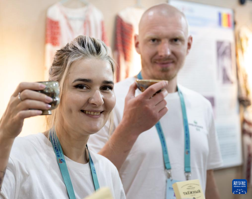 12月9日,来自俄罗斯的艺术家安娜(左)和合作伙伴介绍自己设计制作的陶瓷茶杯。新华社记者 魏培全 摄