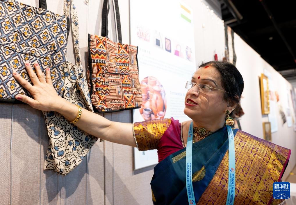 12月9日,来自印度的艺术家拉达在介绍自己的编织包。新华社记者 魏培全 摄