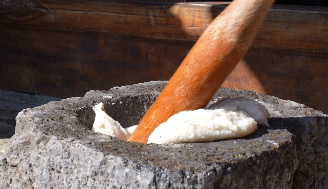 岑巩县羊桥土家族乡杨柳村村民杨顺国:打糍粑非常讲究,必须选择大糯米,浸泡8到12个小时,第二天一早要用清水清洗干净,上甑用猛火蒸熟,蒸熟以后打糍粑,双方要配合默契,在石臼里看到打起泡泡,要能扯起片子,这样打出来的糍粑经得起浸泡,吃起来很绵,很好吃。
