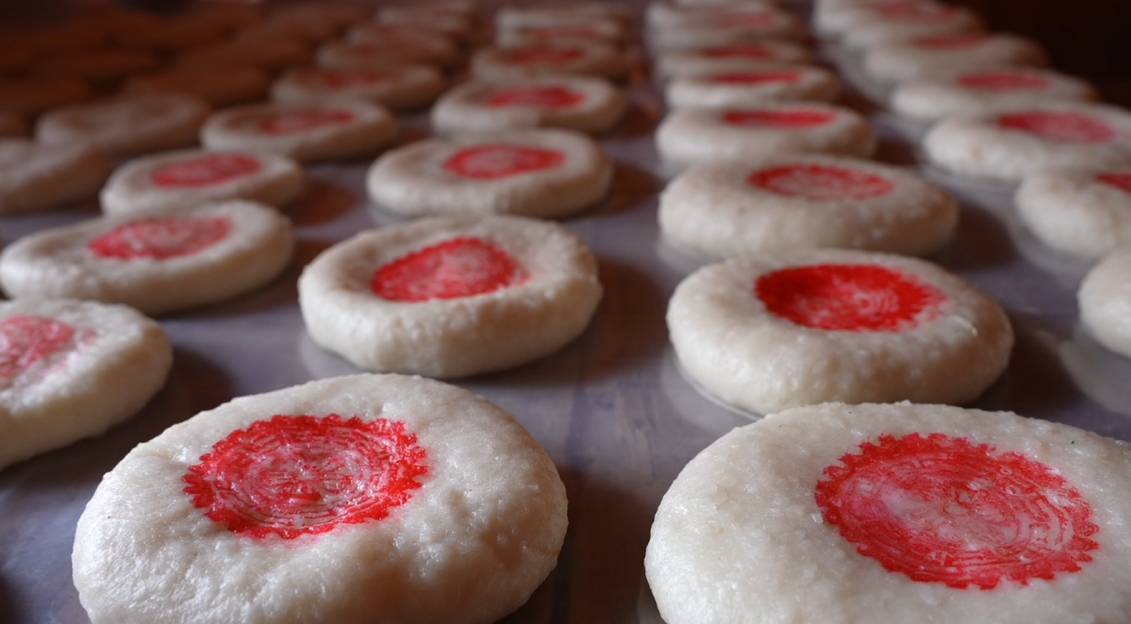 打糍粑不仅是一项体力活,更是一门技术活,需要明确分工,男女协调配合,男人们负责捶打糯米饭,女人们则趁热将被捶打得绵软柔韧细腻的大糯米团搓揉成一个个大小均匀、圆润饱满的小糍粑,并在每个糍粑上进行古老而充满寓意的“点红”仪式,使其增色添祥瑞,承载着人们对团圆、丰收和美好生活的期盼。