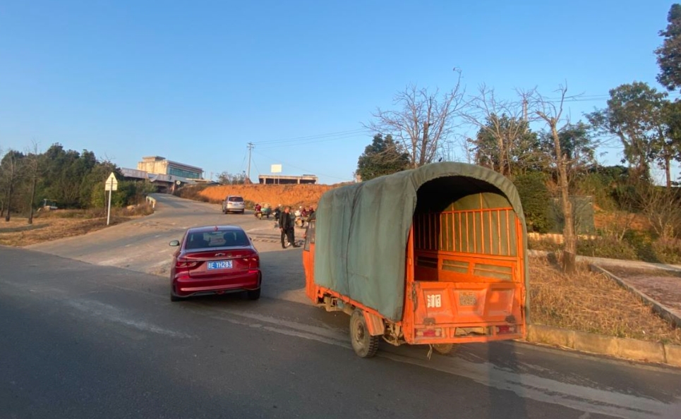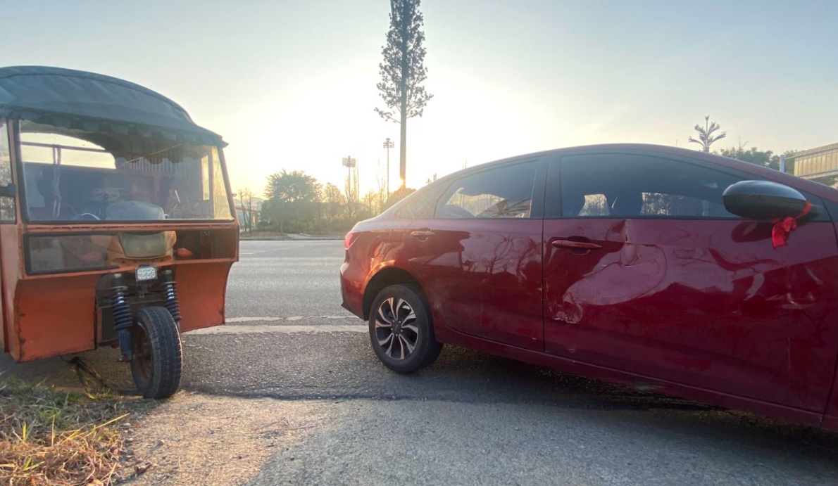 近日,义龙新区鲁屯镇发生了一起小轿车在转弯时,三轮车也相继转弯而导致碰撞的事故。当天下午17时30分左右,义龙交巡警大队事故值班民警接到群众报警电话称,辖区鲁屯镇发生了一起交通事故,需义龙交巡警立即赶往现场进行处置,现场无人员受伤。