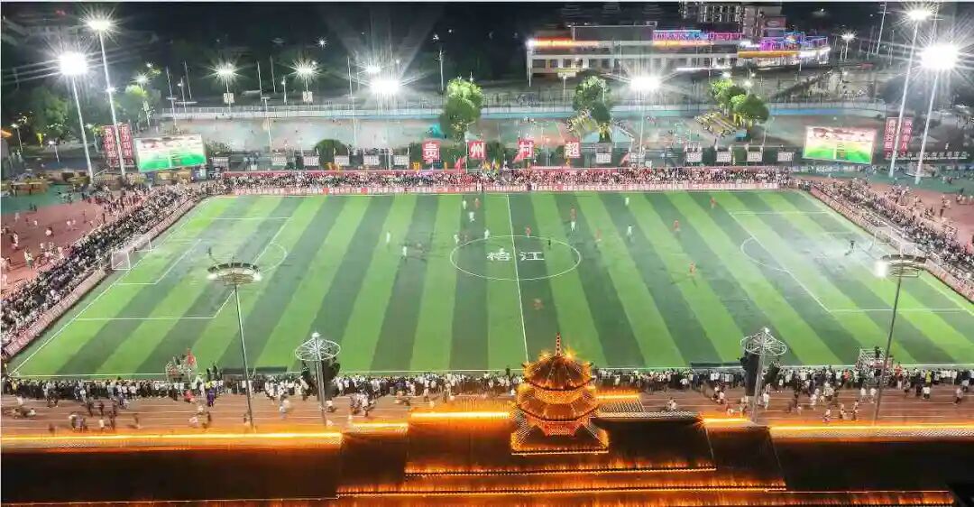 赛事当天,“村超”球场座无虚席。四面八方赶来的球迷群众齐聚赛场,早早守候在看台区域。锣鼓声、呐喊声、助威声此起彼伏,家乡父老挥舞彩旗、高声呐喊,为每一支参赛队伍加油鼓劲。一声声整齐嘹亮的加油口号,一阵阵热烈不息的掌声,化作最温暖的后盾力量,涌动在整片绿茵赛场。