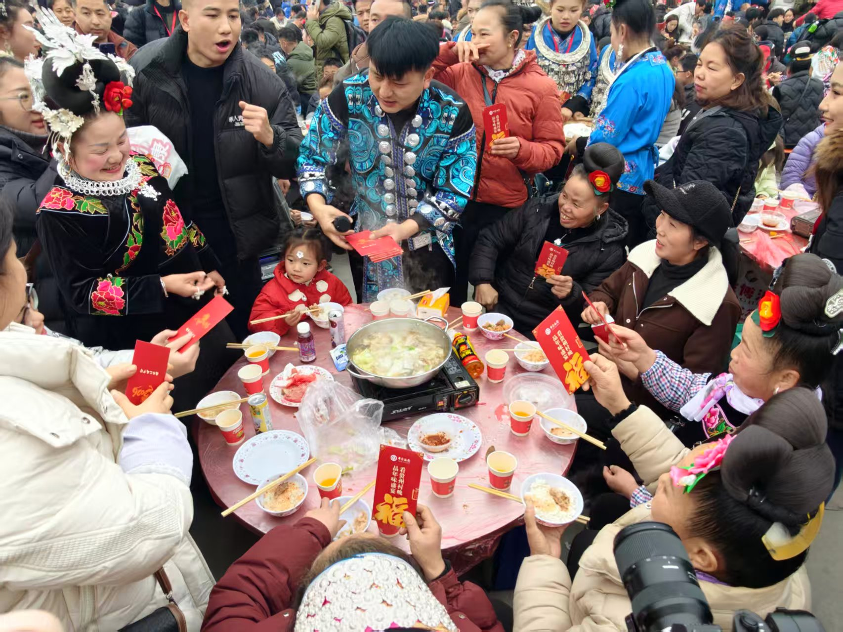 年饭桌上聊的不仅是家常,还有“家门口的金融服务”。中国银行凯里分行青年员工穿梭于“长桌宴”,将消费券呈送到游客手中。同时为农户与个体工商户悉心讲解“酸汤贷”等特色普惠金融产品。