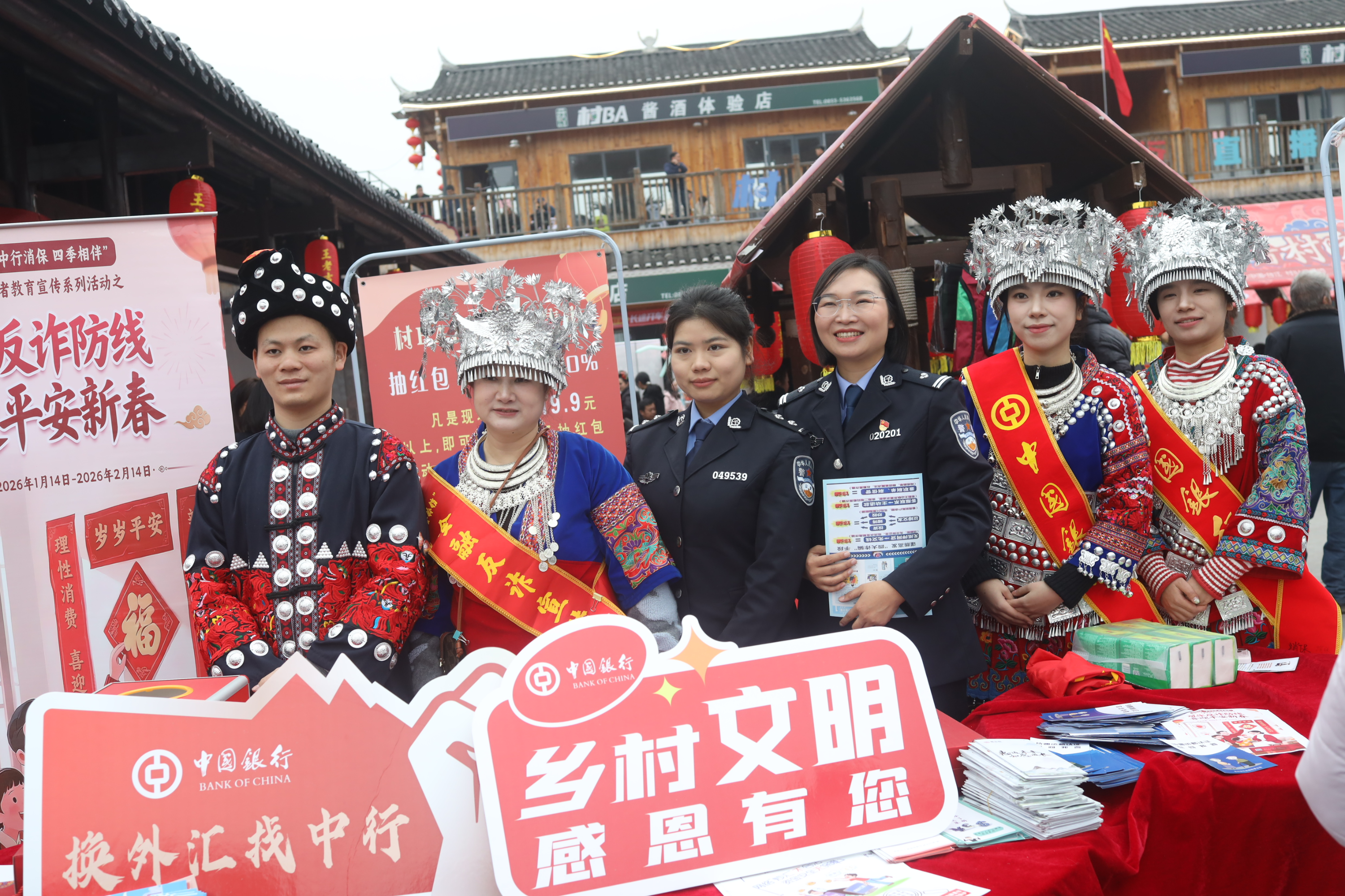 凯里分行联合黔东南州公安局反诈中心、国家外汇管理局黔东南州分局、中国人民银行黔东南州分行、黔东南州及台江县医疗保障局、社会保险事业局等单位,将金融知识普及、反诈宣传、外汇政策解读,以及医保、社保缴纳宣传等,转化为群众喜闻乐见的“年味大餐”,深度嵌入非遗集市展销与“村晚”主会场,既让金融宣传融入百姓生活,也践行了国有大行服务乡村全面振兴、推进普惠金融的使命担当。