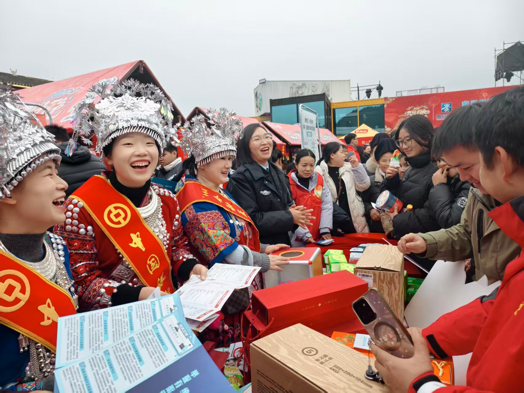 在热闹的非遗集市,民族刺绣、蜡染等手工饰品吸引了众多游客,中行凯里分行在集市上推出“中行惠出行、微信转账有礼”等活动,一份份承载祝福的年货小礼品,迅速点燃了村民与游客的消费热情。