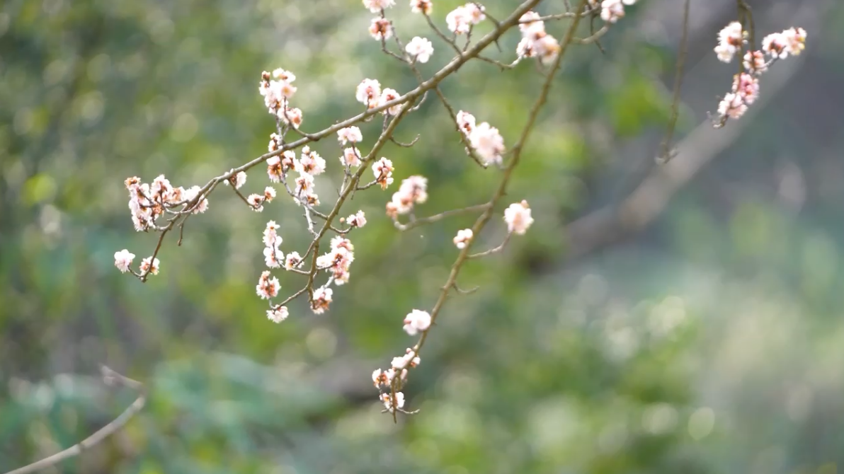 喀斯特山峦间,千亩梅林悄然苏醒,粉白交织的花雾漫过山脊,微风轻拂,花枝摇曳,暗香浮动,整座山谷都浸在温柔的气息里,仿佛在低声诉说着冬与春的私语。