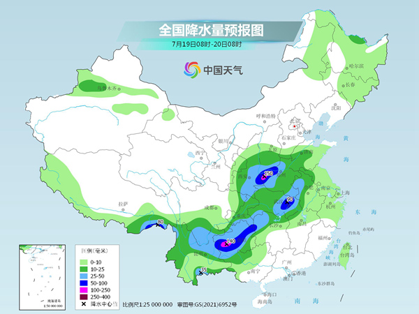 今天开始至20日,副热带高压又将西伸北抬,主雨带东段也将随之北抬,再加上西南低涡快速发展,雨势还将有所加强,西南地区东部、江汉、黄淮、江淮的多地将遭遇强降雨侵袭。