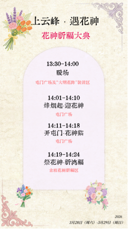 花朝节以“上云峰·遇花神”为主题,将景区打造“一步一景、一景一体验”的沉浸式春日雅集,邀游客共赴一场明潮与花事交织的春日之约。