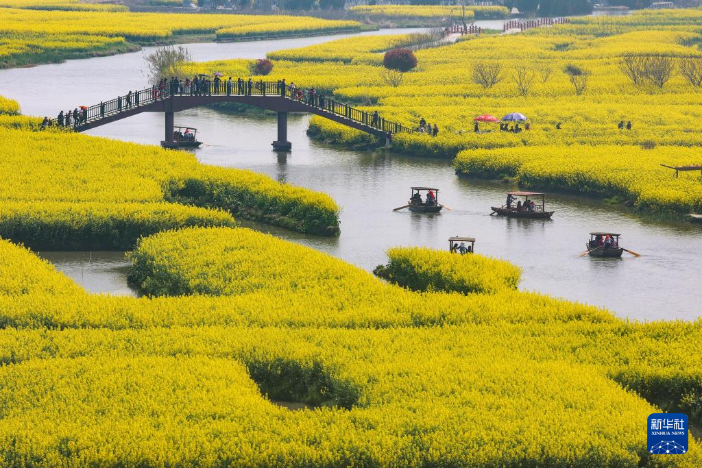 近日,江苏省多地油菜花已进入盛花期,金黄色的油菜花与纵横交错的河道构成“河有万湾多碧水,田无一垛不黄花”的春日画卷。游客或漫步或乘船,徜徉花海,欣赏美景,尽享春日美好。新华社发(史道智摄)