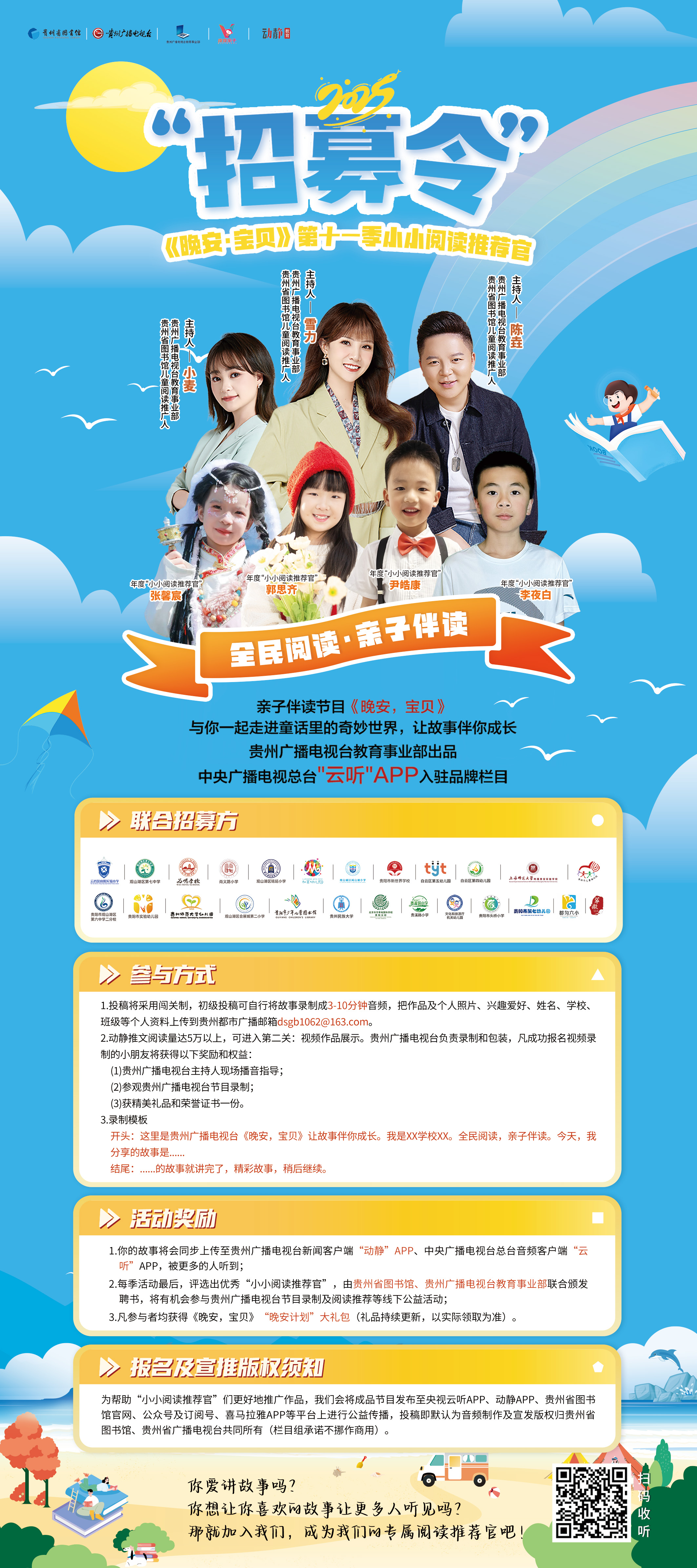 (5)每季活动最后,参加《晚安,宝贝》“小小阅读推荐官”聘书颁发仪式,由贵州省图书馆、贵州广播电视台教育事业部(GTV-6)联合颁发聘书,将有机会参与贵州广播电视台线下阅读公益活动,获得更多展示机会和荣誉。