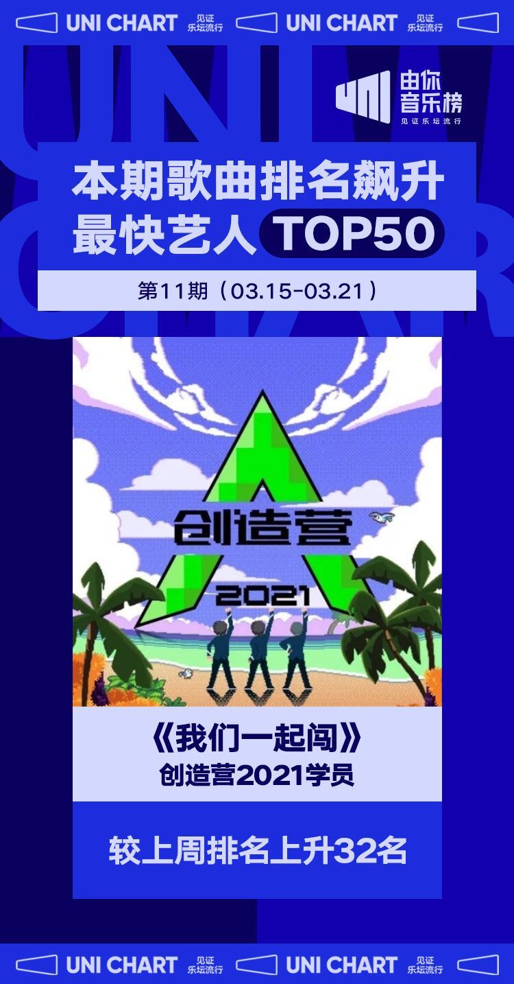 本期歌曲排名飙升最快艺人、团体来自创造营2021学员,其演唱的歌曲《我们一起闯》较上周排名飙升32名,且目前热度还在持续攀升。