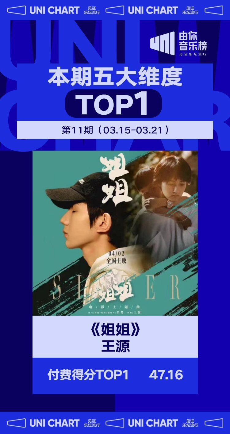 由王源为电影《我的姐姐》演唱的主题曲《姐姐》首次上榜便进入榜单TOP5,成为本期付费得分最高单曲,同时一举拿下了电影原声类成绩最佳单曲的好成绩。