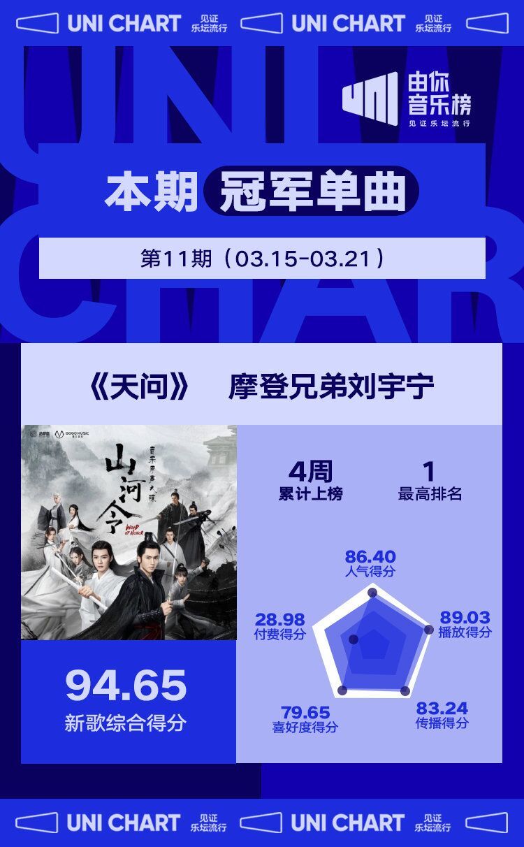 本期冠军单曲来自摩登兄弟刘宇宁 《天问》,同时也是本期电视剧原声类成绩最佳单曲。