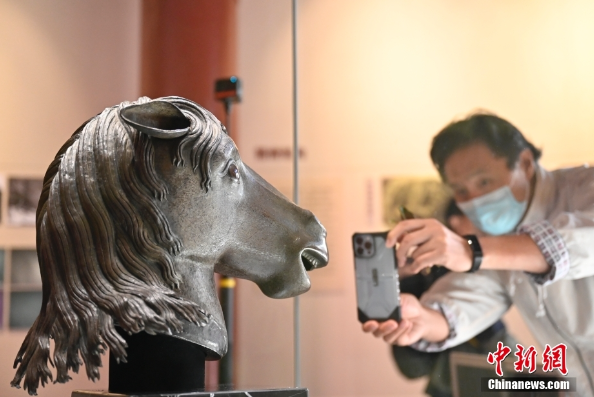 10月20日,在北京圆明园博物馆展出的马首吸引参观者。由保利艺术博物馆收藏的圆明园十二兽首之牛首、虎首、猴首、猪首,时隔163年后首次重聚圆明园,并与马首一起亮相“五首重聚·故园新语”圆明园兽首铜像特别展览。