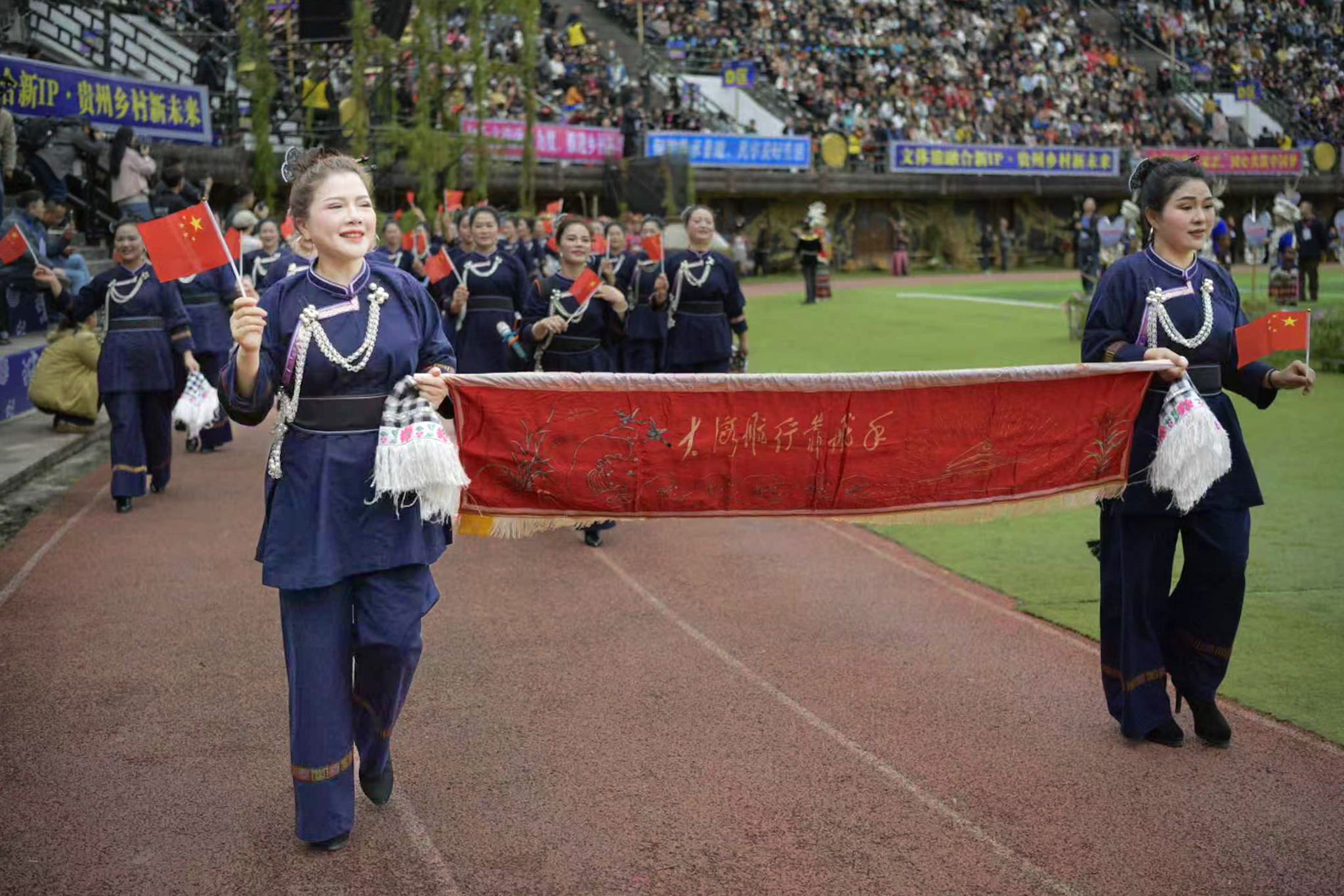 节日序章在《过苗年》的欢快乐曲中开启,礼品方阵抬着丰收果实载歌载舞,《扁担传奇》生动再现苗族先民劳作场景和金秋丰收的喜悦。