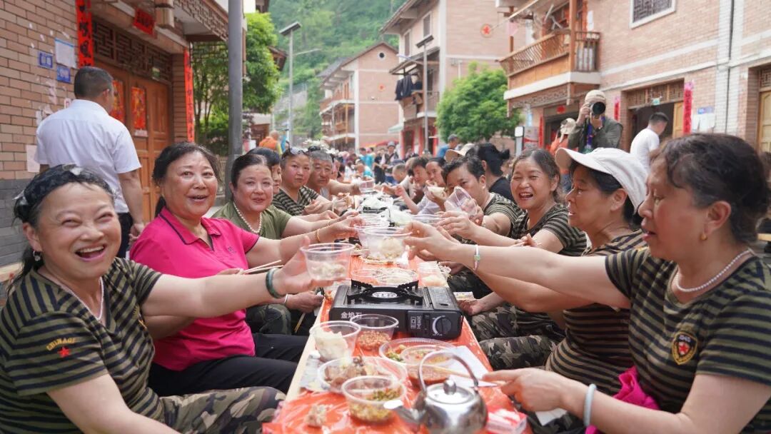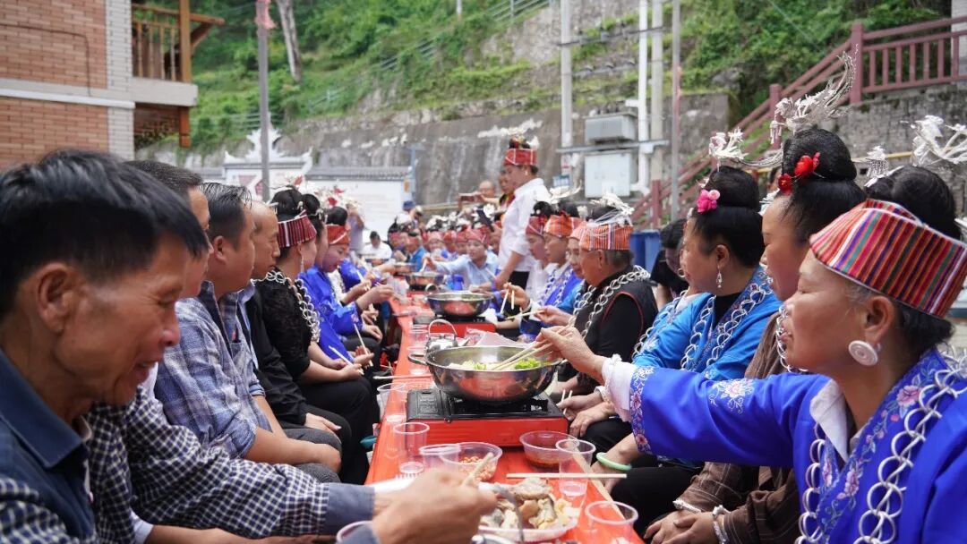 傍晚,石板街上摆起长桌盛宴。侗家姑娘身着盛装,手捧牛角杯,唱着敬酒歌为宾客斟上自酿米酒。酸汤牛肉、糯米饭、白切鸡等侗家美食让游客大饱口福。夜幕降临,篝火再次燃起,侗乡群众与八方宾朋欢聚共舞,共赏民俗风情,共话民族团结温情。