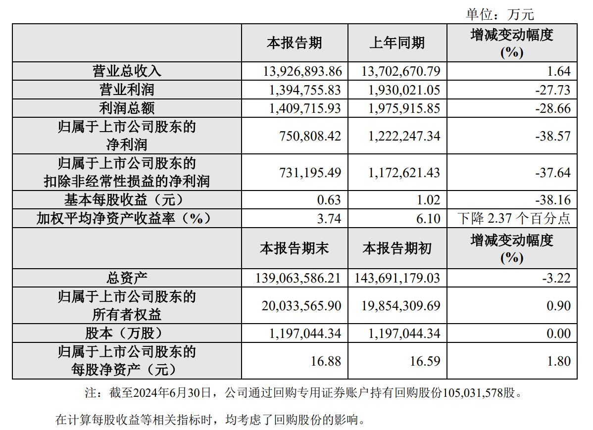 在财务指标方面,保利发展上半年的基本每股收益为0.63元,同比减少了38.16%;加权平均净资产收益率为3.74%,同比下降了2.37个百分点;总资产为1.39万亿万元,同比减少了3.22%;归属于上市公司股东的所有者权益为2003亿元,同比增长了0.90%。
