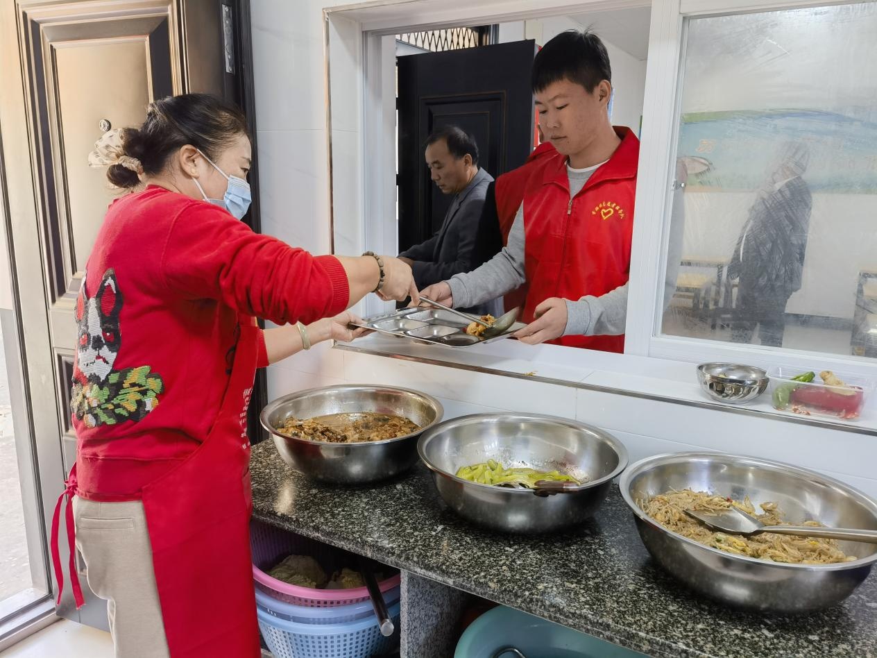 临近中午,服务窗口摆上了红烧鱼块、海带排骨汤等适合老年人口味的菜肴,村里的志愿服务队帮助老人们盛满饭菜,端上餐桌,老人们围坐在一起边吃边聊,处处洋溢着幸福的味道。